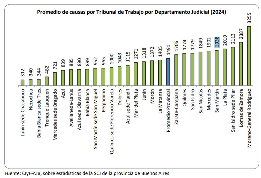 El promedio provincial fue de 1.491 causas laborales por tribunal, pero en Moreno-General Rodríguez (3.255), Lomas de Zamora (2.387), San Isidro (2.113), La Plata (2019) y San Martín (1.938) se encontraban entre los cinco que estaban por encima de la media en las causas iniciadas por tribunal.