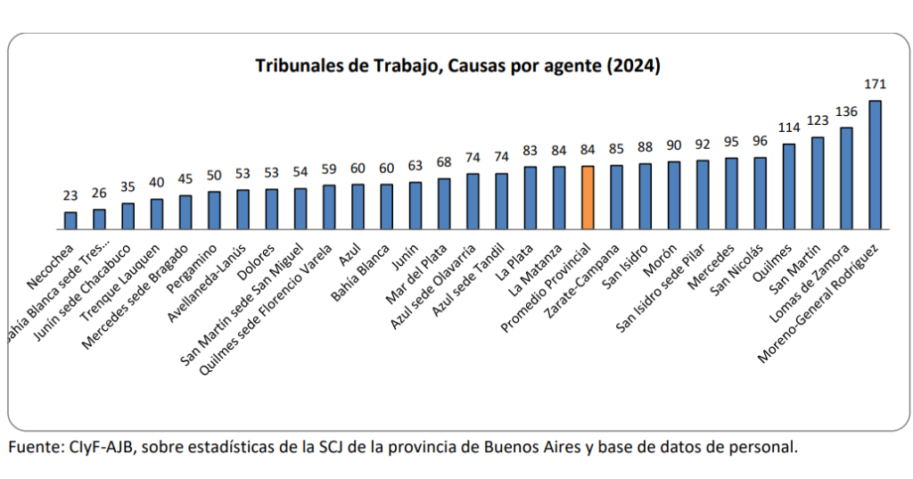 El promedio de causas por agente también muestra una situación alarmante: Moreno, con 171 juicios, duplica el promedio provincial, que es de 84, lo que pone en evidencia un nivel de carga laboral extrema que impacta directamente en la salud del personal y en los tiempos de resolución para los trabajadores que buscan justicia.