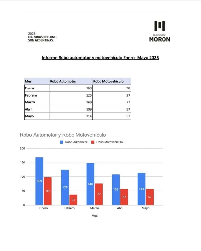 Los números dados a conocer por la cartera moronense reflejan que durante enero se cometieron 169 hechos de robo automotor, mientras que en el quinto mes del año la cifra descendió a 114. Respecto al robo de motos, se registraron 98 hechos el primer mes del año, en tanto que en mayo la cantidad de delitos de este tipo cayó a 57.