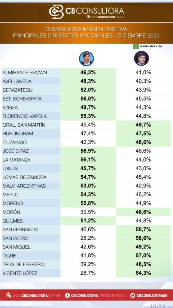 La Consultora CB publicó este mes el ranking de imagen de los intendentes de la provincia de Buenos Aires; además, hizo lo propio con Axel Kicillof y Javier Milei en los municipios del Conurbano. Se trata de una muestra de 15.196 casos relevada entre el 14 y el 18 de diciembre.