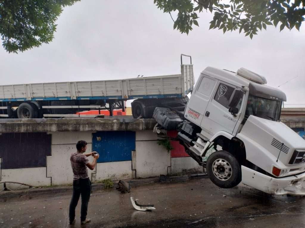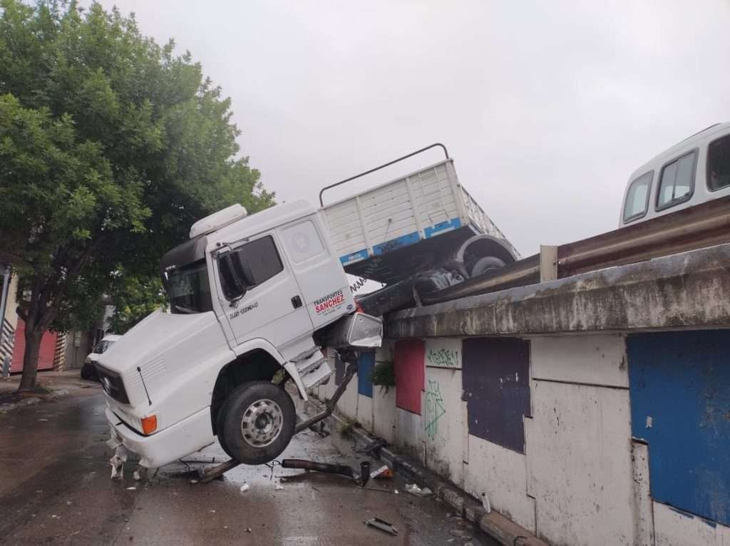 El incidente víal ocurrió pasadas las 10 de la mañana de este miércoles, cuando el conductor de un camión de la empres Transportes Sánchez perdió el control del vehículo, se deslizó por la calzada y cayó hacia la calle Migueletes, mano a la autopista Ricchieri. Por suerte, se trata de una zona donde el puente recién comienza a elevarse, por lo que medio acoplado quedó sobre la calzada mientra que la cabina terminó casi apoyada en la calle paralela.