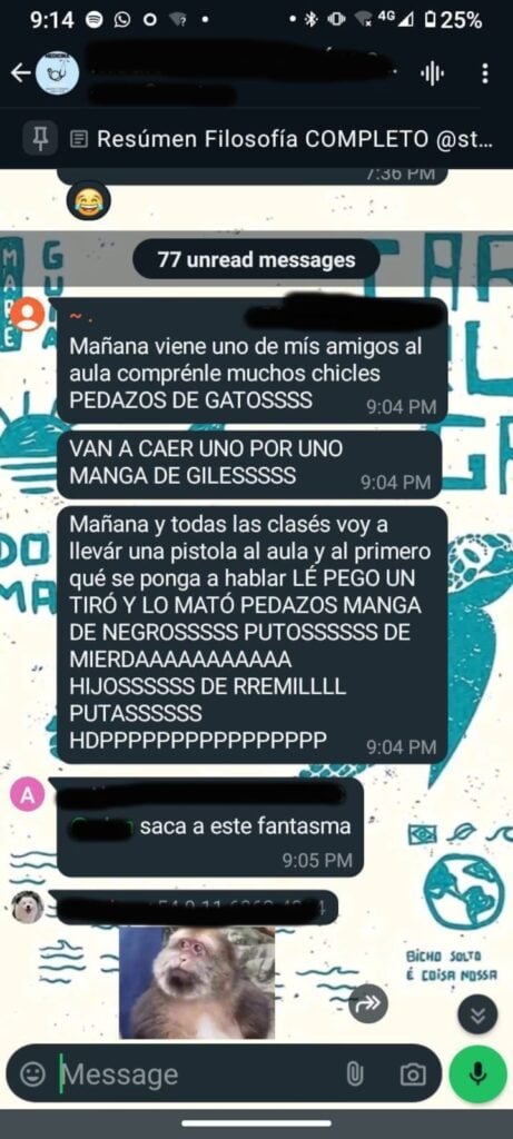 “Mañana viene uno de mis amigos al aula, cómprenle muchos chicles pedazos de gatos. Van a caer uno por uno manga de giles”, escribió en una primera instancia el joven.