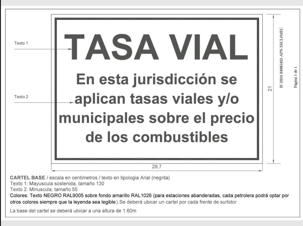 El gobierno nacional dispuso que las estaciones de servicio deberán exhibir un cartel con la siguiente leyenda: «En esta jurisdicción se aplican tasas viales y/o municipales sobre el precio de los combustibles. Para más información, podrá consultar la página web de la Secretaría de Energía».