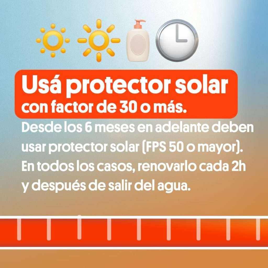• Usar protector solar con factor de 30 o superior y renovarlo cada 2 horas y después de salir del agua.