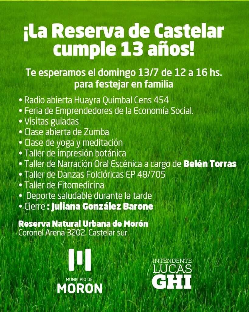 Este domingo, el Municipio de Morón invita a la comunidad a celebrar el 13° aniversario de la Reserva Natural Urbana (RNU) de Castelar, un espacio emblemático de preservación ambiental y encuentro ciudadano. La jornada contará con una amplia agenda de actividades culturales, artísticas y recreativas, con entrada libre y gratuita.