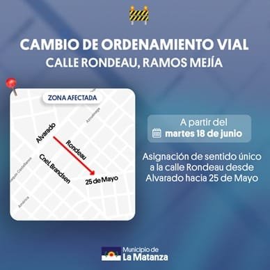 A partir del martes 18 de junio, se realizará un cambio de ordenamiento vial, por el cual la calle Rondeau, en Ramos Mejía, pasará a tener sentido único desde la calle Alvarado hacia la calle 25 de Mayo.