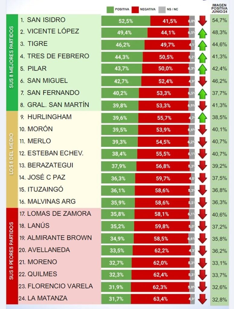 En la Primera sección (norte y oeste del conurbano), Milei tuvo su imagen positiva más alta en San Isidro, mientras que el mayor rechazo se ubicó en Moreno, donde el rechazo al libertario alcanzó el 62%.