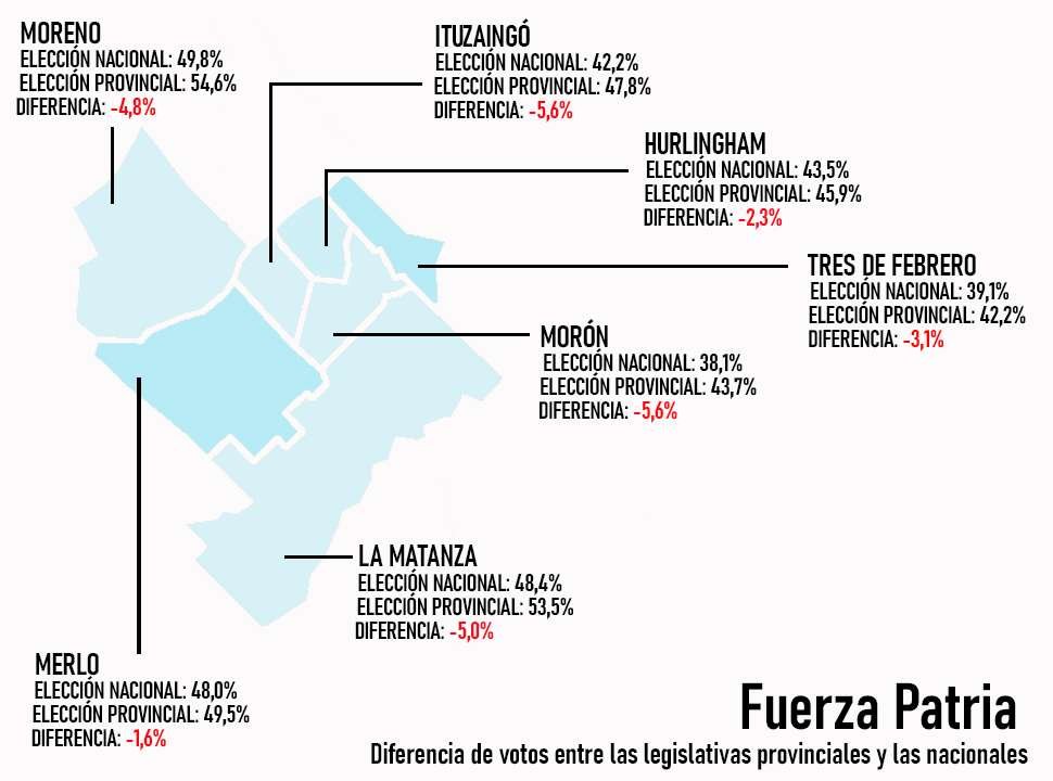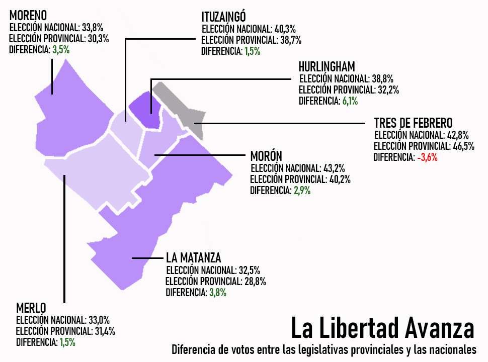 En el populoso partido de La Matanza, Taiana logró el 48,44% frente al 32,52% de Santilli. En septiembre, la ex intendenta y actual vicegobernadora, Verónica Magario había sido una de las grandes ganadoras de aquellas elecciones cuando el oficialismo local se impuso con el 53,34%, frente al 28,63% de LLA. Entre una y otra elección el peronismo perdió 5 puntos, mientras que los libertarios sumaron 3,8%.