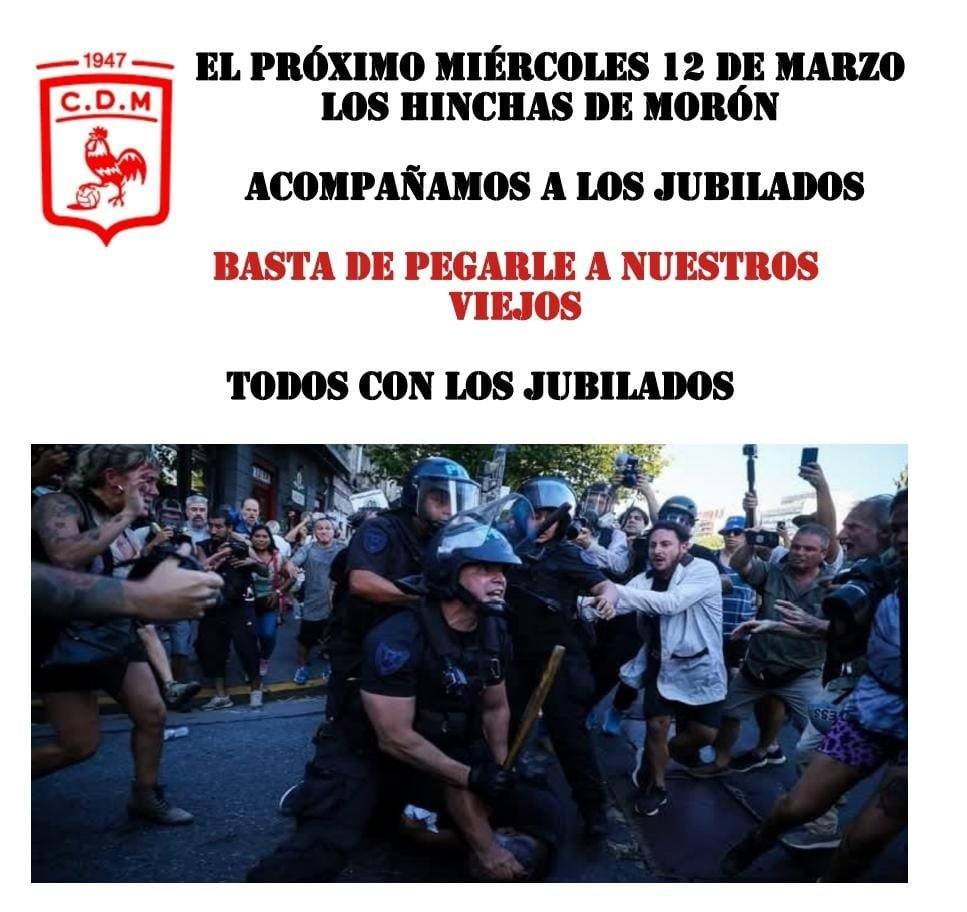 «El próximo miércoles los hinchas de Morón acompañamos a los jubilados, basta de pegarle a nuestros viejos, todos con los jubilados«, reza el afiche que diseñaron simpatizantes del Gallo en redes sociales.