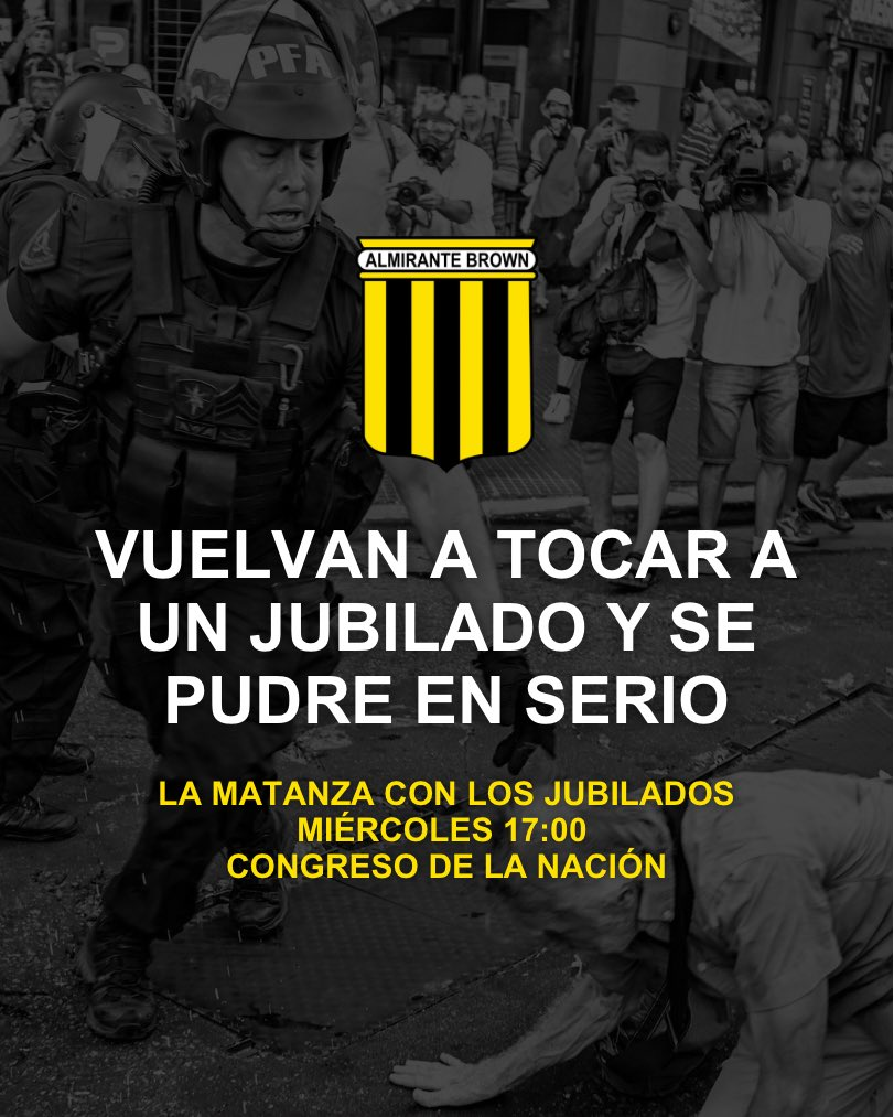 «La Matanza con los jubilados» y «vuelven a tocar a un jubilado y se pudre en serio» pusieron desde Almirante Brown en el cartel que convoca a todos sus hinchas a ir al Congreso por los jubilados.