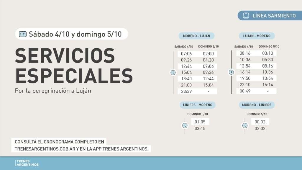 Según informó la empresa, el sábado circularán siete servicios adicionales entre Moreno y Luján a las 7:06, 9:26, 12:44, 15:04, 18:40, 21:00 y 23:39, y la misma cantidad de trenes entre Luján y Moreno que saldrán a las 8:16, 10:36, 13:54, 16:14, 19:50, 22.10 y 0:49 -este último correspondiente al domingo-