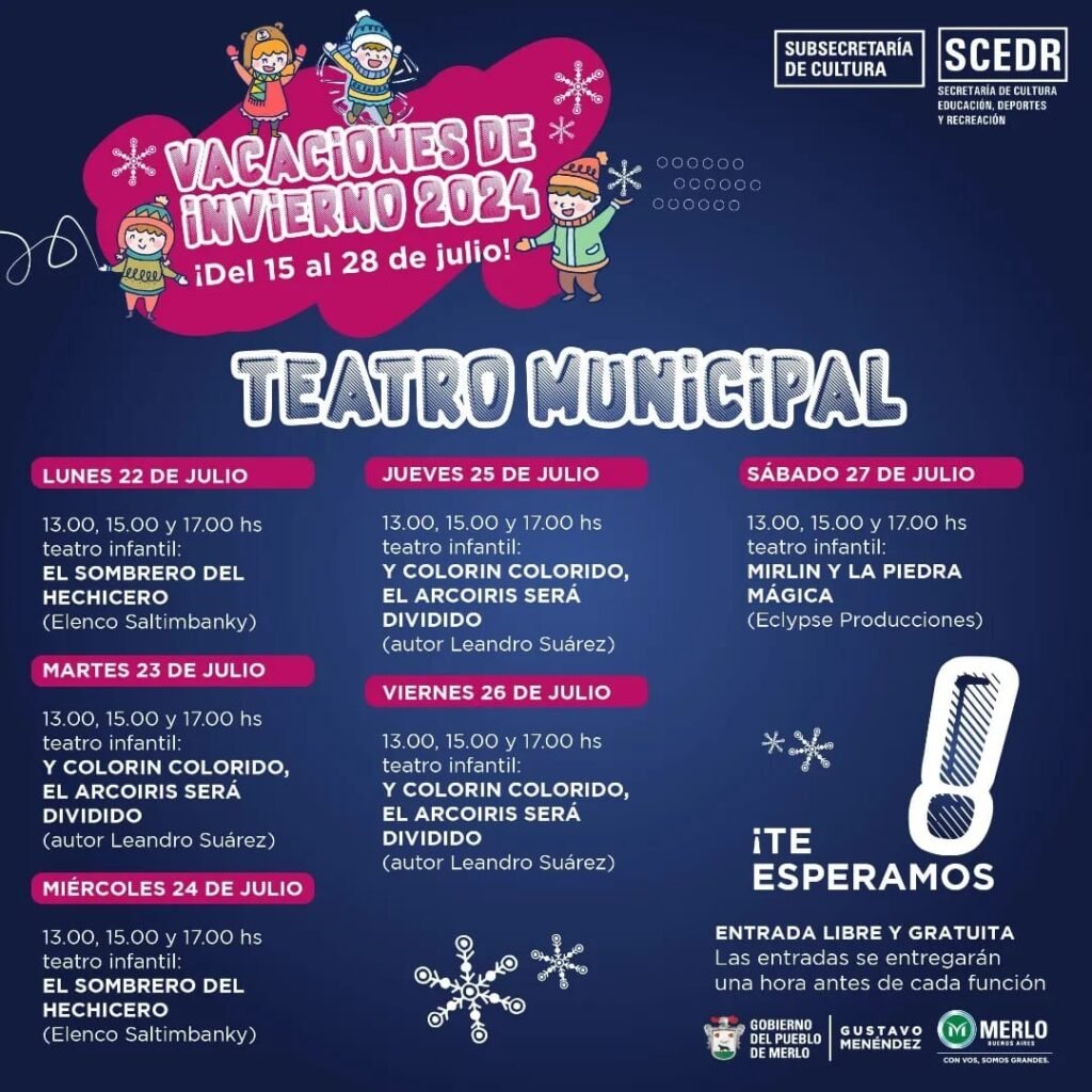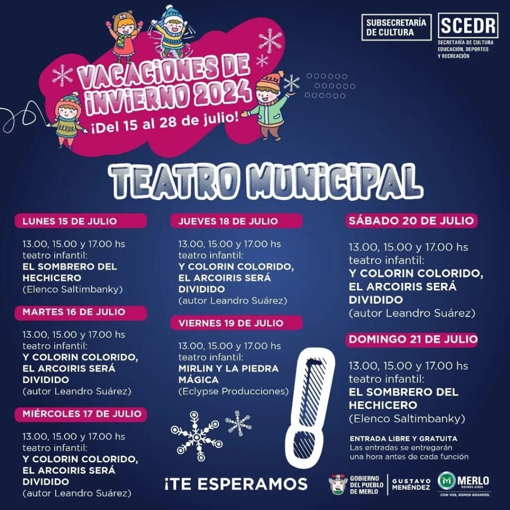 A lo largo de las dos semanas del receso escolar de invierno, los diferentes espacios municipales destinados a la Cultura, serán escenario de innumerables propuestas. Entre los que se encuentran: el Teatro Municipal Leopoldo Marechal de Ramos Mejía, el Teatro Municipal de la Casa de Cultura de Gregorio de Laferrere, el Museo Histórico Municipal de Virrey del Pino y la Casa de Cultura Pierina Dealessi de Villa Luzuriaga; quienes pondrán en escena obras teatrales infantiles como Sonorautas, Molina y Gusmán Circus, Mundo Arlequín, Radio Funka, 1,2,3 Magia, Tito y Coloso, Viaje infinito por compañía Telescópica, Desordenados y Amigos por el mundo, entre otras.