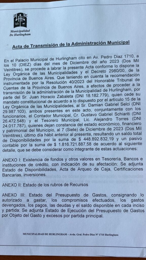 “Además, Hurlingham viene viviendo desde hace un tiempo un temporal financiero, presupuestario y de gestión. Es lo que hace que la situación económica del municipio sea muy mala. Peor de lo que me esperaba”, indicó el intendente, quien advirtió que tras su paso como mandatario local interino cuando Zabaleta asumió como ministro de Alberto Férnandez, entre agosto de 2021 y octubre de 2022, dejó unos 943 millones de pesos en las arcas municipales y unos 443 millones de pesos de deuda. “Era un municipio superavitario. Teníamos más plata que la que debíamos. Ahora la situación está al revés”, añadió.