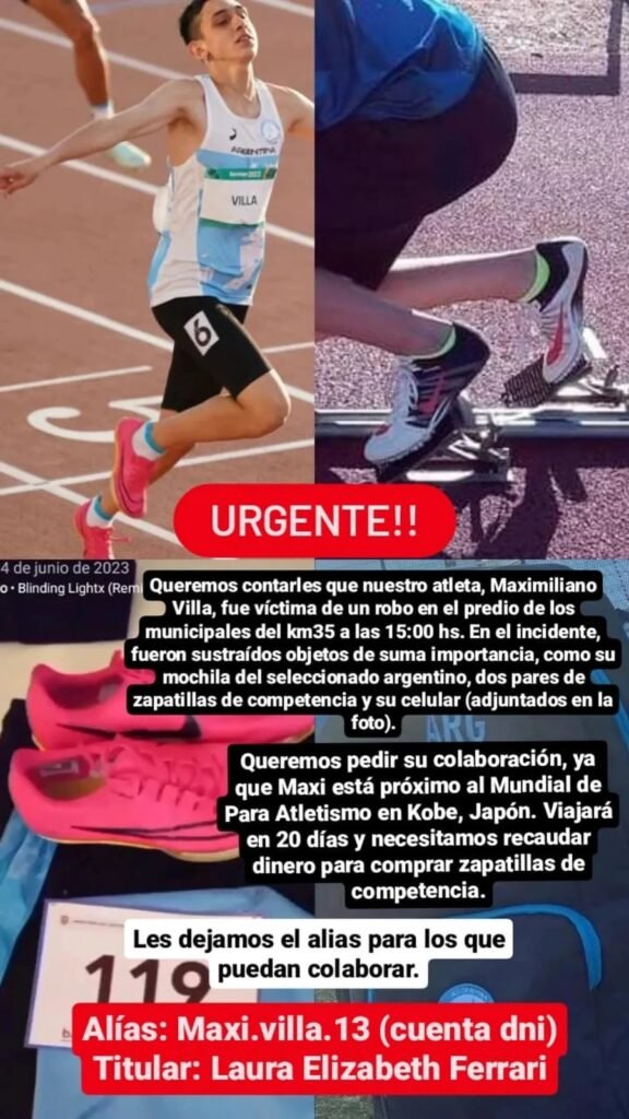 La familia del atleta organizó una colecta por medio de la cuenta DNI maxi.villa.13, a nombre de la mamá de Maximiliano, Laura Elizabeth Ferrari, para intentar reponer los elementos robados.